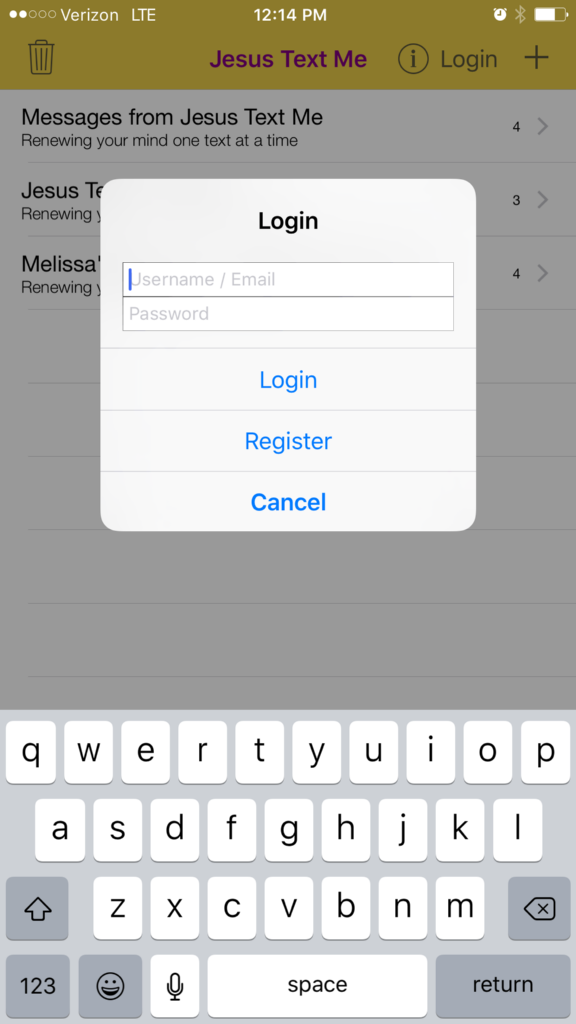 Once you register, you will use your Username and Password to add your personalized messages to the App.